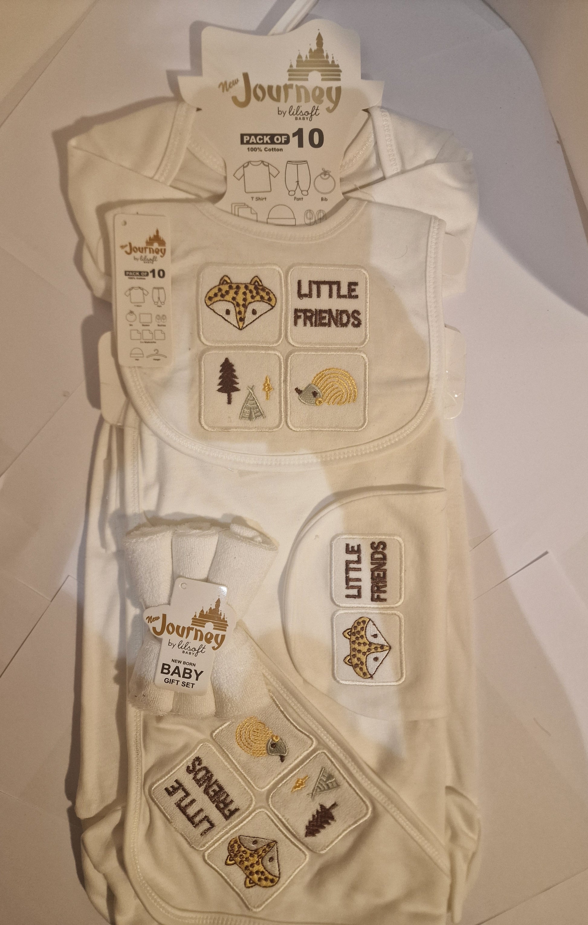 Lilsoft Baby 10-Piece "New Journey" Newborn Gift Set – Little Friends (White/Gold)