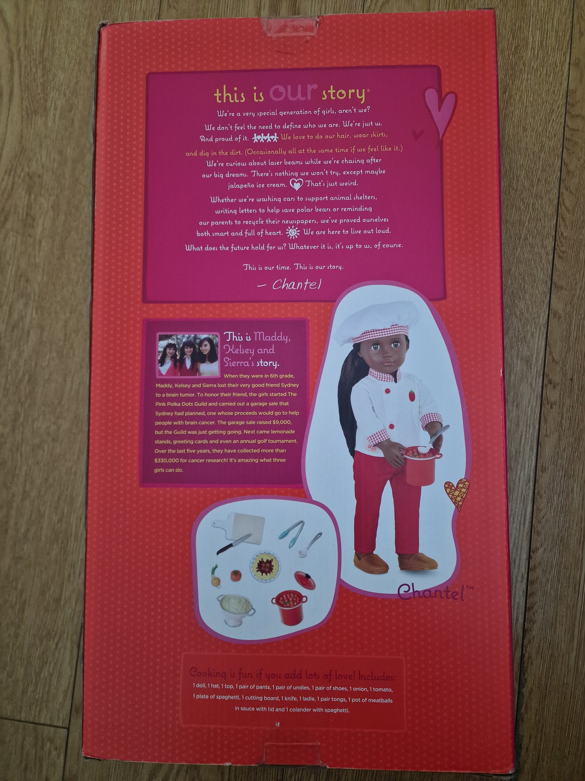 Cook up delicious fun with Chantel! This Our Generation 18-inch pasta chef doll has dark-green eyes that open and close, long brown hair that’s fun to brush and style, and all the ingredients to create sweet and savory adventures. Once Chantel has her chef’s hat and cooking uniform on, it’s time to start cooking. Chop up the tomato and onion on the cutting board to prepare Chantel’s special meatball sauce recipe, then cover up the pot with the lid as you strain the spaghetti in the colander. Time to eat! Plop the spaghetti in the plate with the tongs accessory and pour the meatball sauce on top with the ladle to complete the perfect pasta dish! Cooking with friends is always fun when you have the right ingredients!