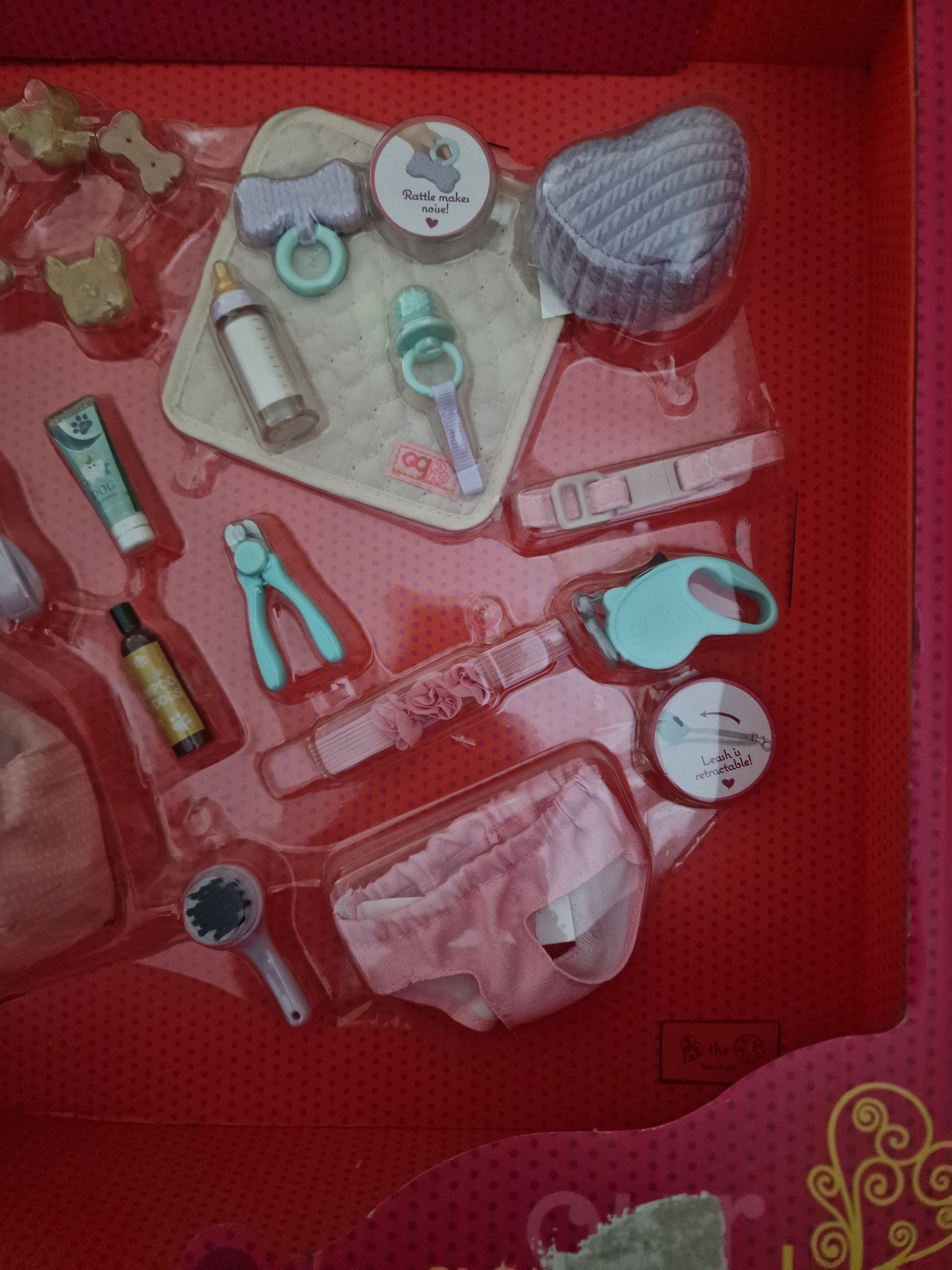 Our Generation Happy Puppies. Teach your dolls how to care for younger pets with the Our Generation Happy Puppies pet care set! Clean your pups with the shampoo bottle and brush their soft fur with the hairbrush. Then dress your pup in the puppy diaper and lay down the blanket pad as you train them to go potty. Are they being a good pup? Give them a treat with the dog cookies as they learn! Place your pup in the zip-up dog carrier when it’s time to travel and carry them with the comfy straps. Or clip the leash to their collar to take them for a walk around the neighborhood. The leash can be made longer or shorter so your dolls can keep them by their side at all times!
